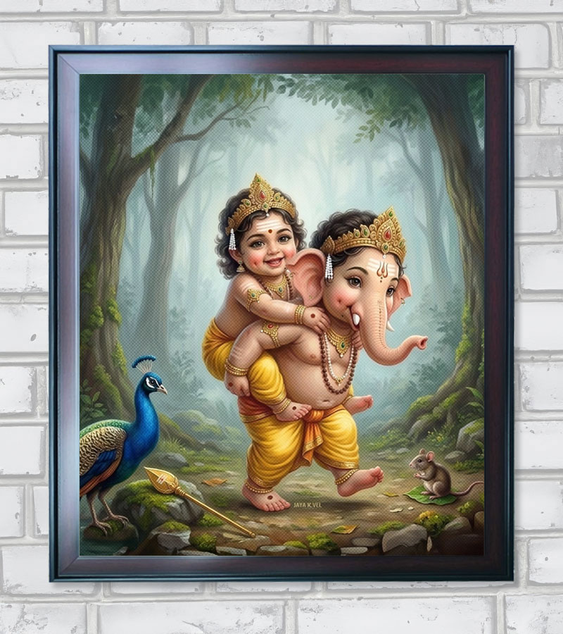 Ganesh and Murugan – Bundle of Joy. The Concept Art is elegantly framed with a premium matte finish. Available in A3 size, along with an original UHD soft copy in 300 DPI for high-quality digital use. Please note that the display image is covered with dots, which will not appear in the printed photo.